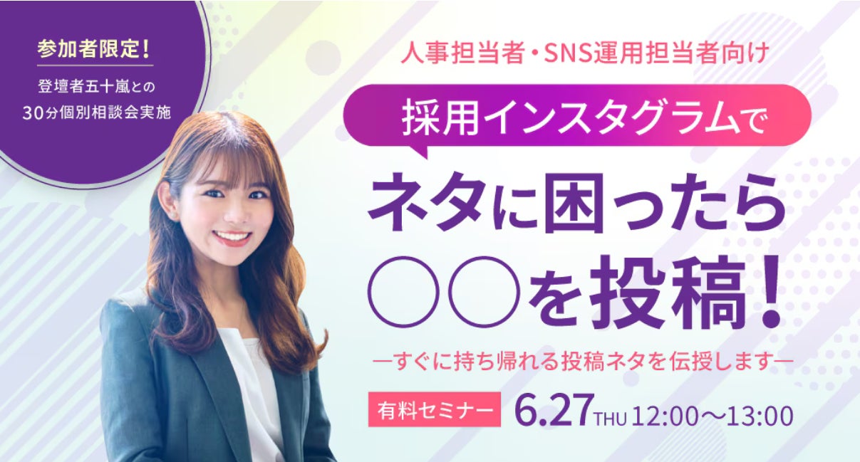 タイトル:【人事担当者・SNS運用担当者向け】採用インスタグラムでネタに困ったら○○を投稿!~すぐに持ち帰れる投稿ネタを伝授します~