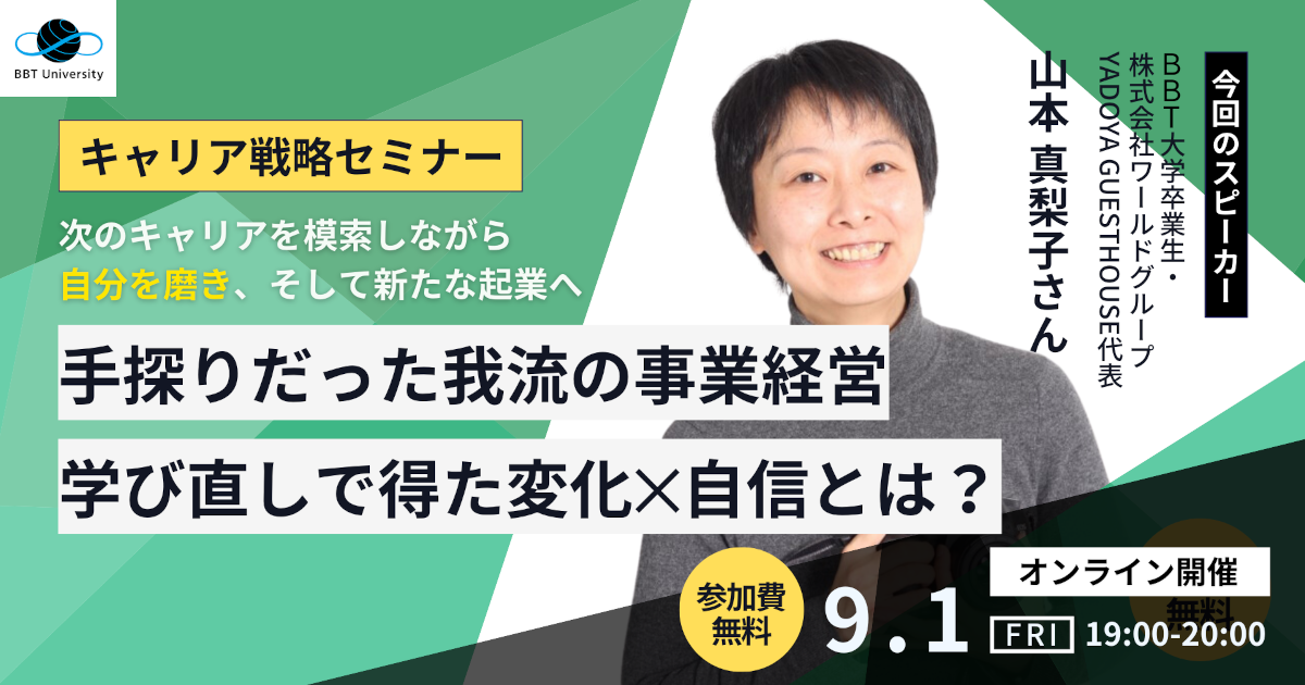このような背景をもとに、BBT大学主催のキャリア戦略セミナーが9月1日(金)19時から開催されます。セミナーでは、BBT大学アルムナイの山本氏をゲストスピーカーとして迎え、彼女の経験や学びを共有いただきます。