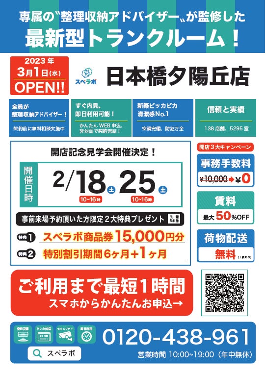 【日本橋夕陽丘店/3月1日(水)オープン】見学から契約、解約まで完全非接触・非対面、お申し込みからご利用まで最短1時間!絶賛運営中のトランクルーム【スペラボ】が四天王寺前夕陽ヶ丘駅近くに出店!
