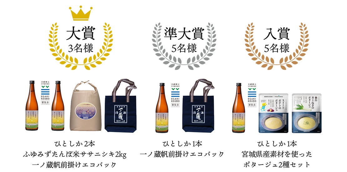 投稿者の中から選出された大賞3名には、「一ノ蔵 ひとしか」2本のほか、同商品の原料米である「ふゆみずたんぼ米ササニシキ(大崎市田尻産)」2kg、さらに明治20年創業の老舗「永勘染工場」が手がける帆前掛けバッグを含む、エシカルをテーマとした豪華セットが贈られるという。