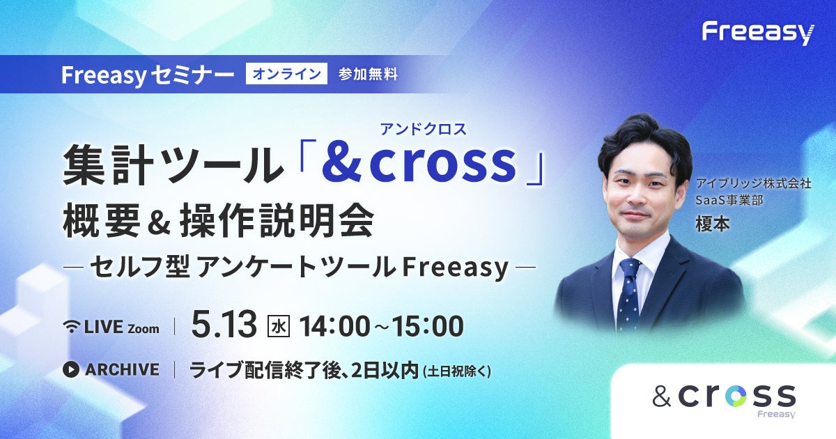 年間3万件以上の調査実績を誇る、国内最大級のセルフ型アンケートツール「Freeasy(フリージー)」を展開するアイブリッジ株式会社(本社:大阪市福島区、代表取締役社長:荒川和也)は、2026年5月13日(水)14時より、『【オンラインセミナー】集計ツール「&cross」の概要&操作説明会(セルフ型アンケートツールFreeasy)』を開催いたします。