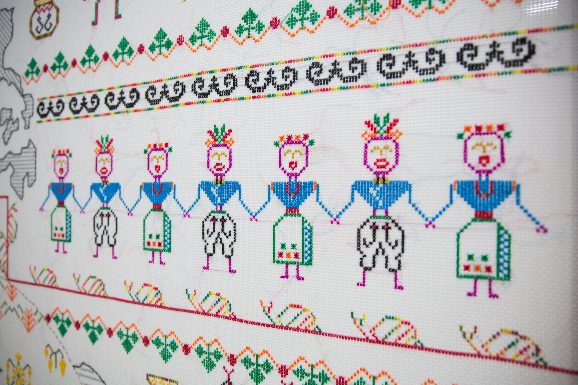 ・侯怡亭(ホウ・イーティン)《所有的小姐 Sóo-ū -ê sió-tsiá》では、日本文化の影響を受けた台湾語の歌詞を刺繍として表現し、言語の背景にある歴史や社会の記憶を浮かび上がらせる。