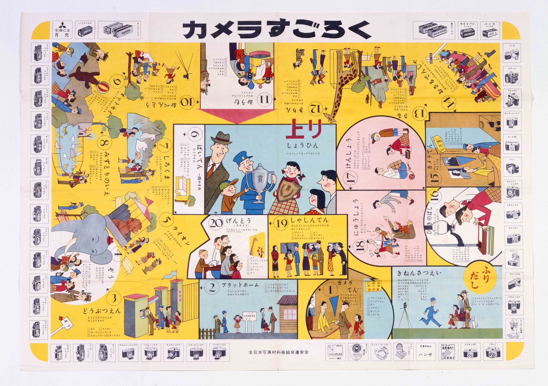 ・十返舎一九『東海道中膝栗毛』(1802–1814)を起点に、昭和中期の《カメラ双六》を展示。双六と写真文化の関係をたどる。