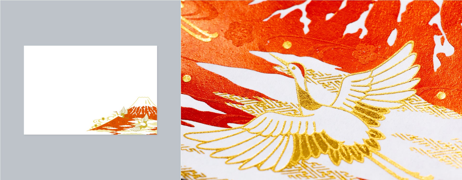 朝焼けに染まる赤富士と、長寿を象徴する鶴の組み合わせは、繁栄と吉運の頂点を表します。