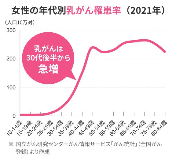 乳がんの罹患率は30代後半から急増します*¹。そのため、女性は女性専用のがん保険で早いうちから備えておけると安心です。