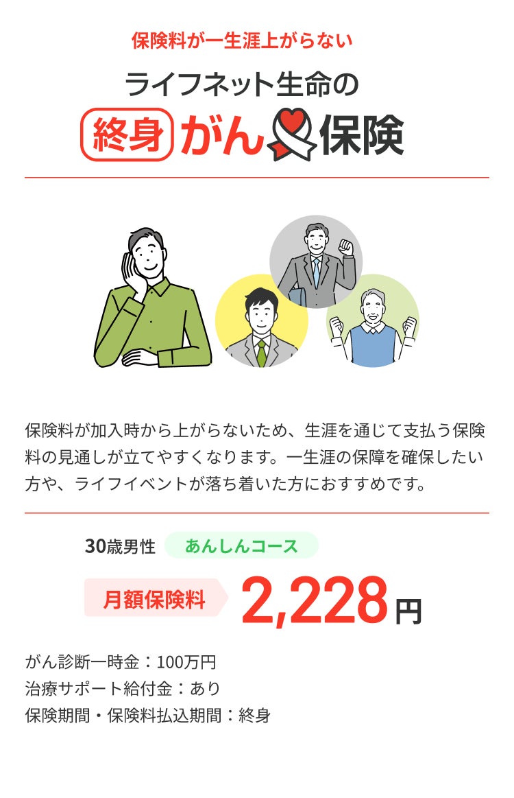 保障を手厚くしておきたい働き盛りの方は、定期型のがん保険で保険料を抑えて必要な期間に絞ってがんの保障を確保し、貯蓄もある程度用意ができて支出も落ち着いてきた方は、保障が一生涯続く終身型のがん保険にするなど、ニーズに合わせて保険期間をお選びいただけます。