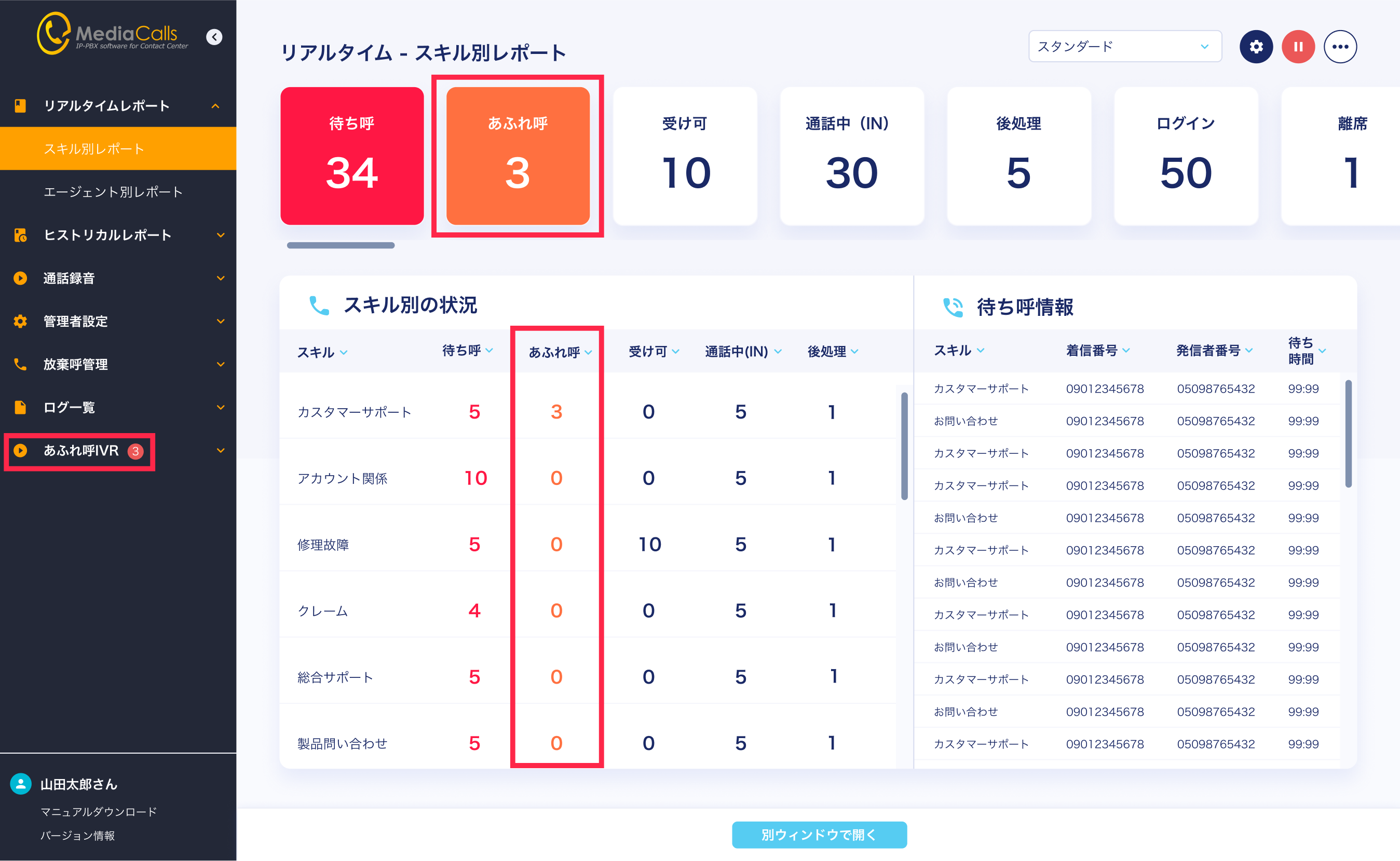 なお、「現在発生しているあふれ呼件数」についても管理画面から瞬時に把握することが可能です。件数はメニュー上でバッジ表示されるほか、レポート画面でわかりやすく表示されます。