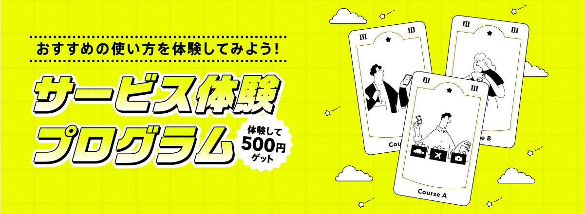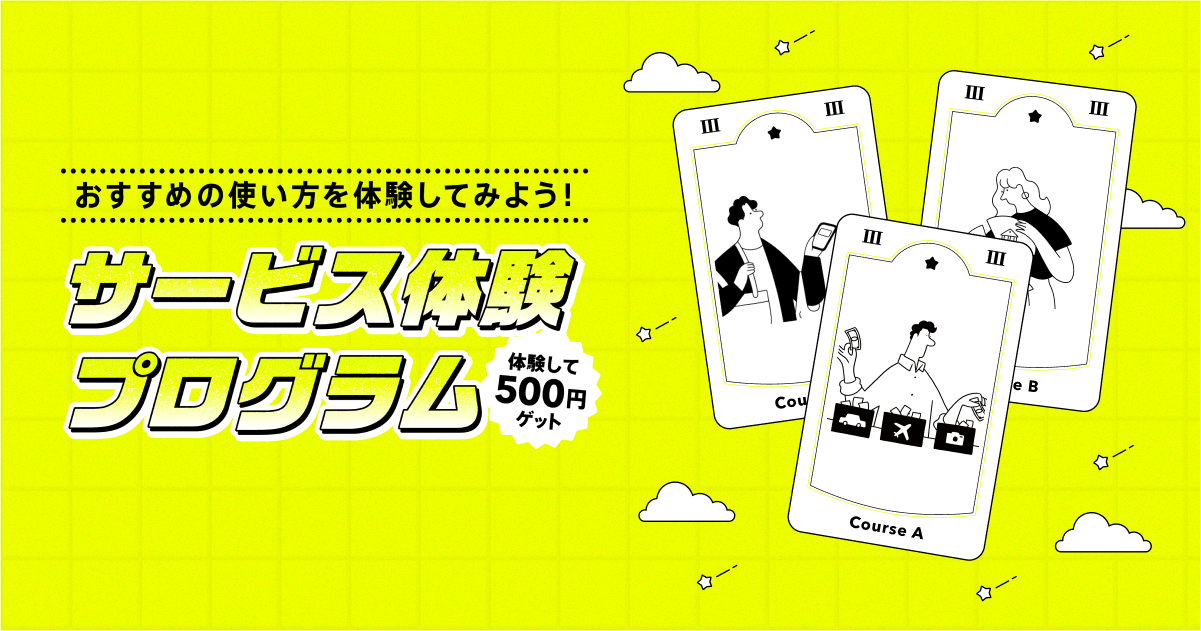 プログラム内容 | 口座開設月から翌月末までにエントリーし、3つのコースのいずれか1つの条件を達成した方にもれなく現金500円をプレゼント A. お金の仕分け体験コース:お金を仕分けて管理する使い方を体験するコース B. ハブ口座体験コース:複数の口座やカードを一元管理する使い方を体験するコース C. 即時決済体験コース:デビットカードで即時決済を体験するコース |