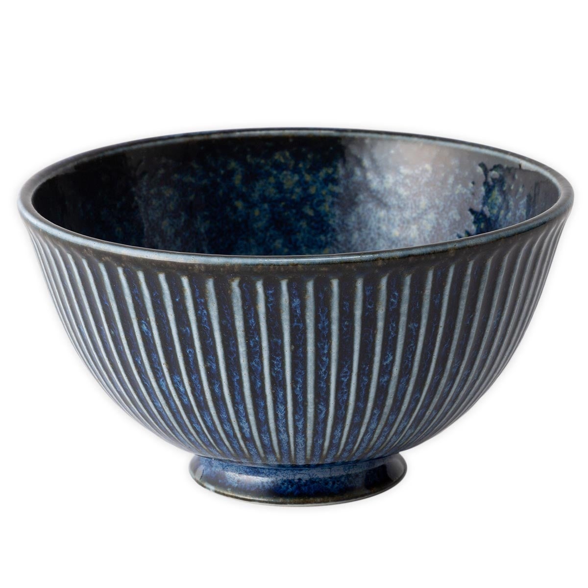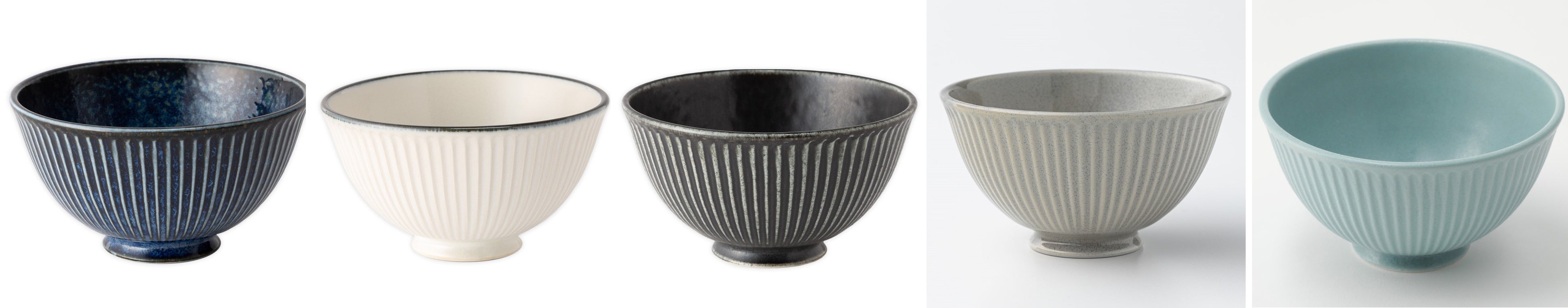 (左から、窯変紺、呉須流し、いぶし天目、銀灰釉、シンプル柄をご用意)