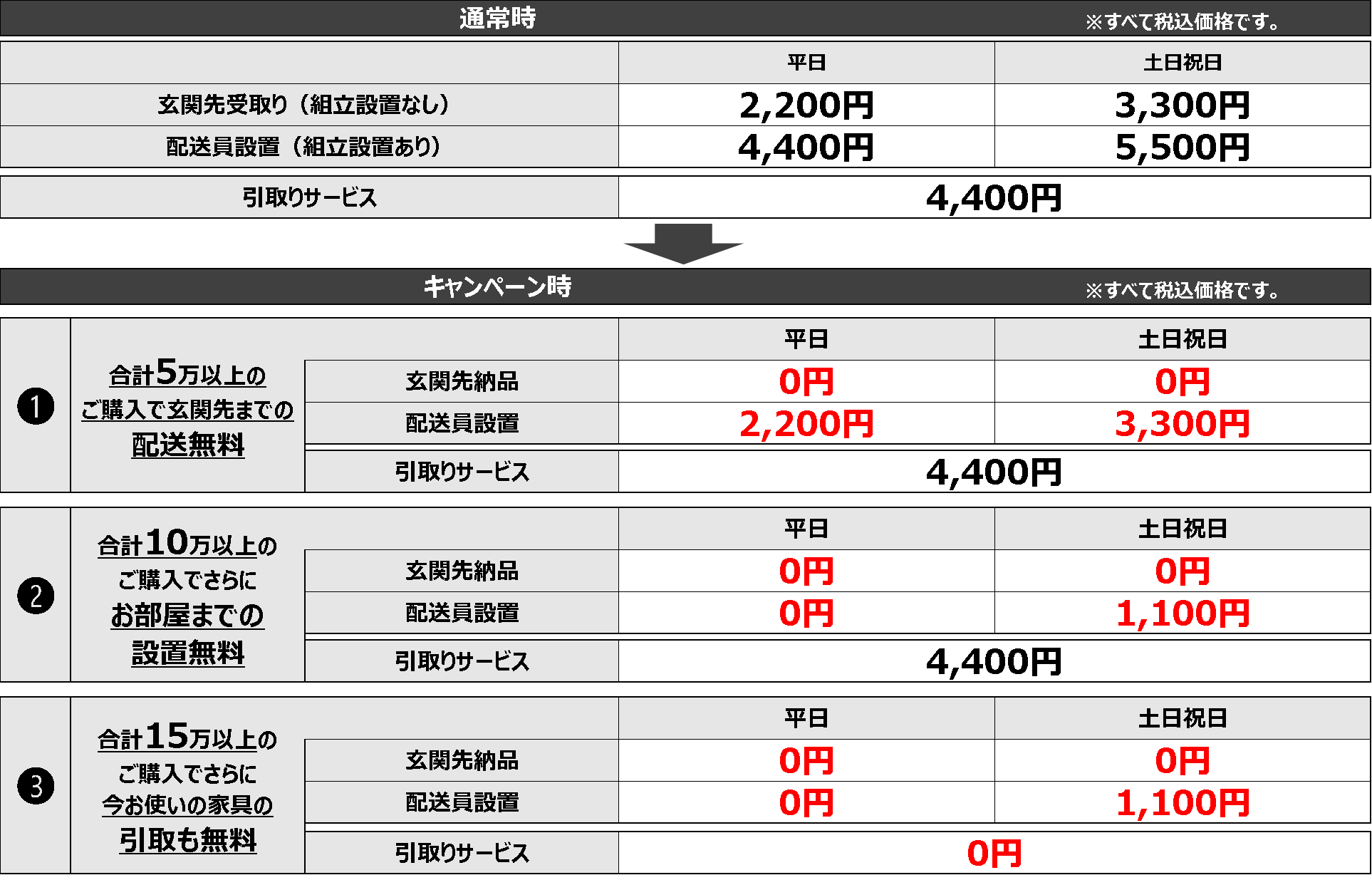②合計税込み10万円以上のご購入で、さらにお部屋への設置まで無料