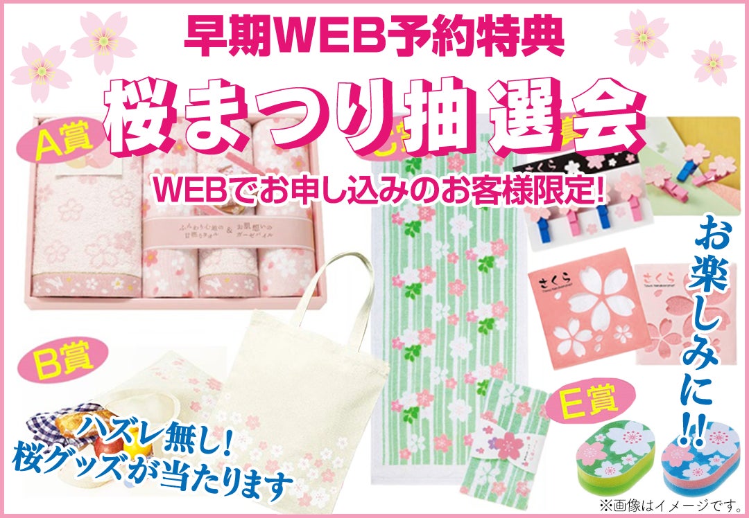 早期WEB予約をお申込みのお客様限定で、ハズレくじなしの「桜まつり抽選会」にご参加いただけます。可愛らしい桜模様のタオルやバック、小物など、桜グッズが当たります。