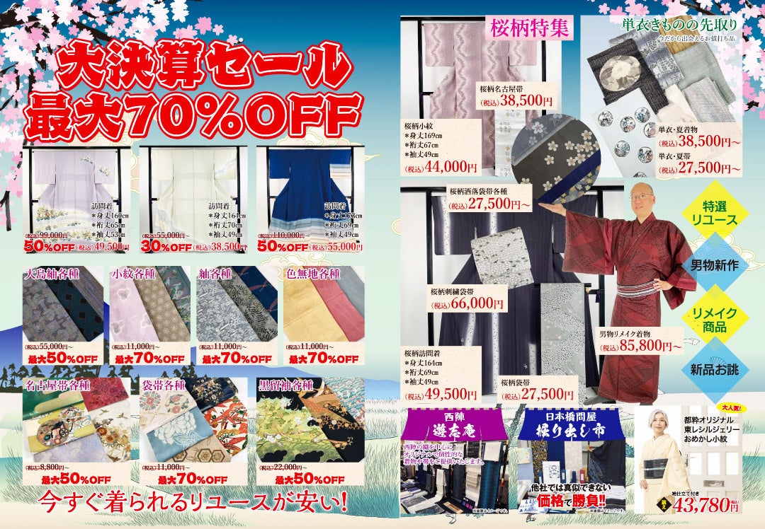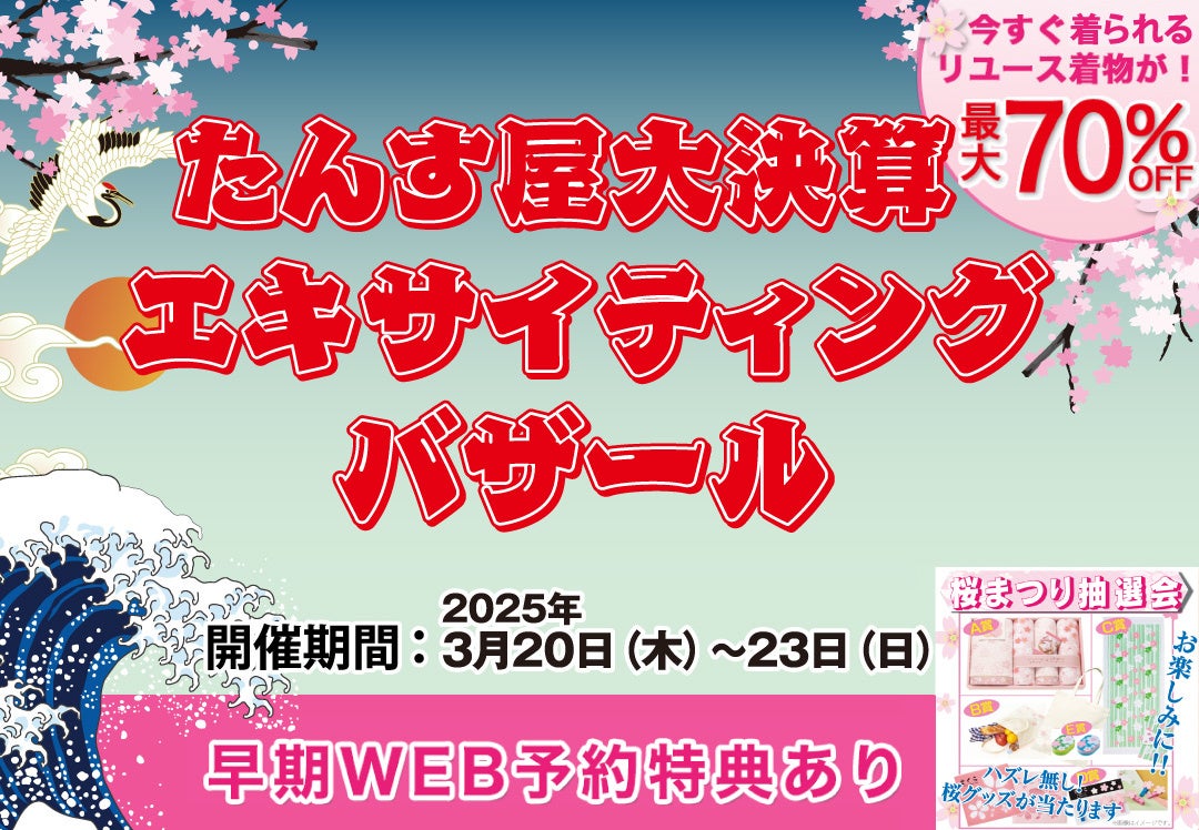 リユース着物「たんす屋」の大型着物イベント、大決算エキサイティングバザール。会場は、東京都立産業貿易センター台東館5階。早期WEB予約特典「桜まつり抽選会」のご参加で、桜グッズが当たります。