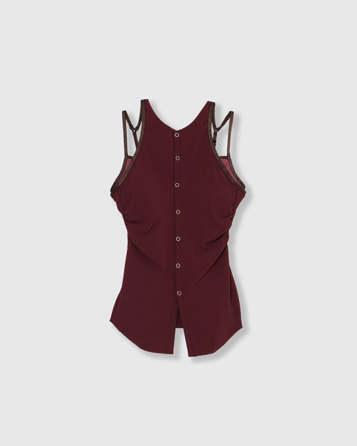 トップス:OPEN BACK LAYERED SWIM TOP ¥20,900(tax in) Color:BEIGE / BORDEAUX / BLACK