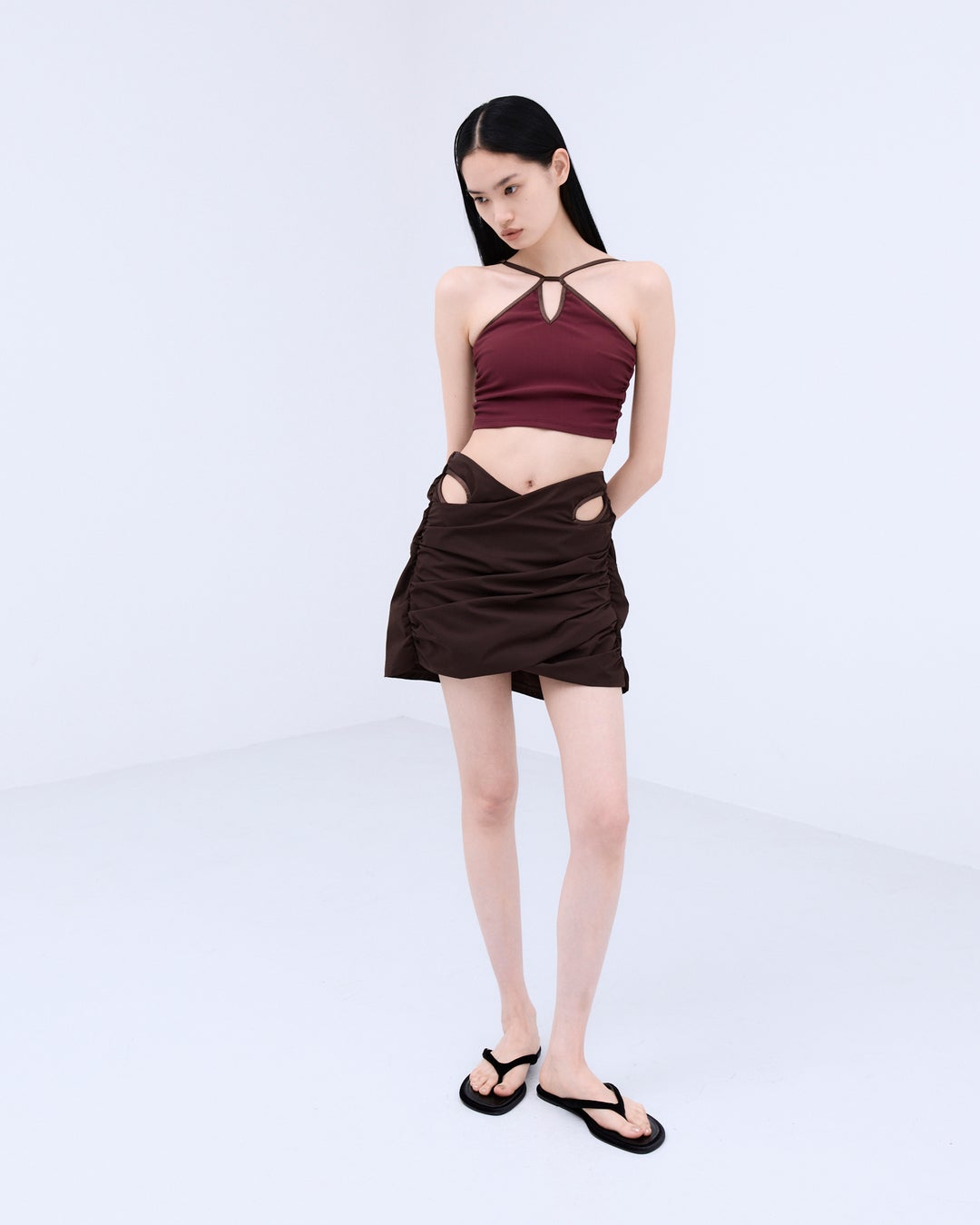 ボトムス:GATHERED TAFFETA SWIM BOTTOM ¥17,600(tax in) Color:BROWN / BLACK