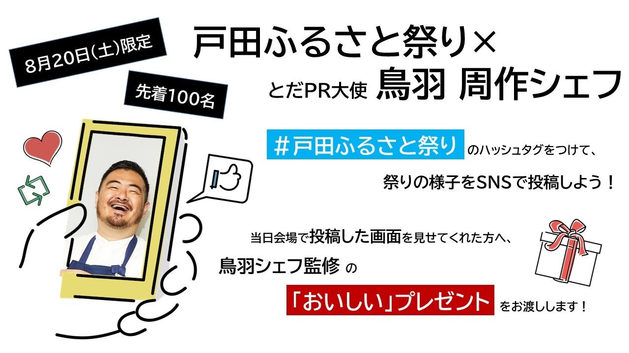 この企画は、戸田ふるさと祭りへ来場し、ツイッターやインスタグラムなど自身のSNSのアカウントで、ハッシュタグ「#戸田ふるさと祭り」を付けて祭りの様子を投稿し、本部テントで投稿画面を見せてくれた方先着100名に鳥羽シェフが監修した「おいしい」商品をプレゼントするものであり、鳥羽シェフの強みである「食」と「SNS」を掛け合わせた企画となっています。