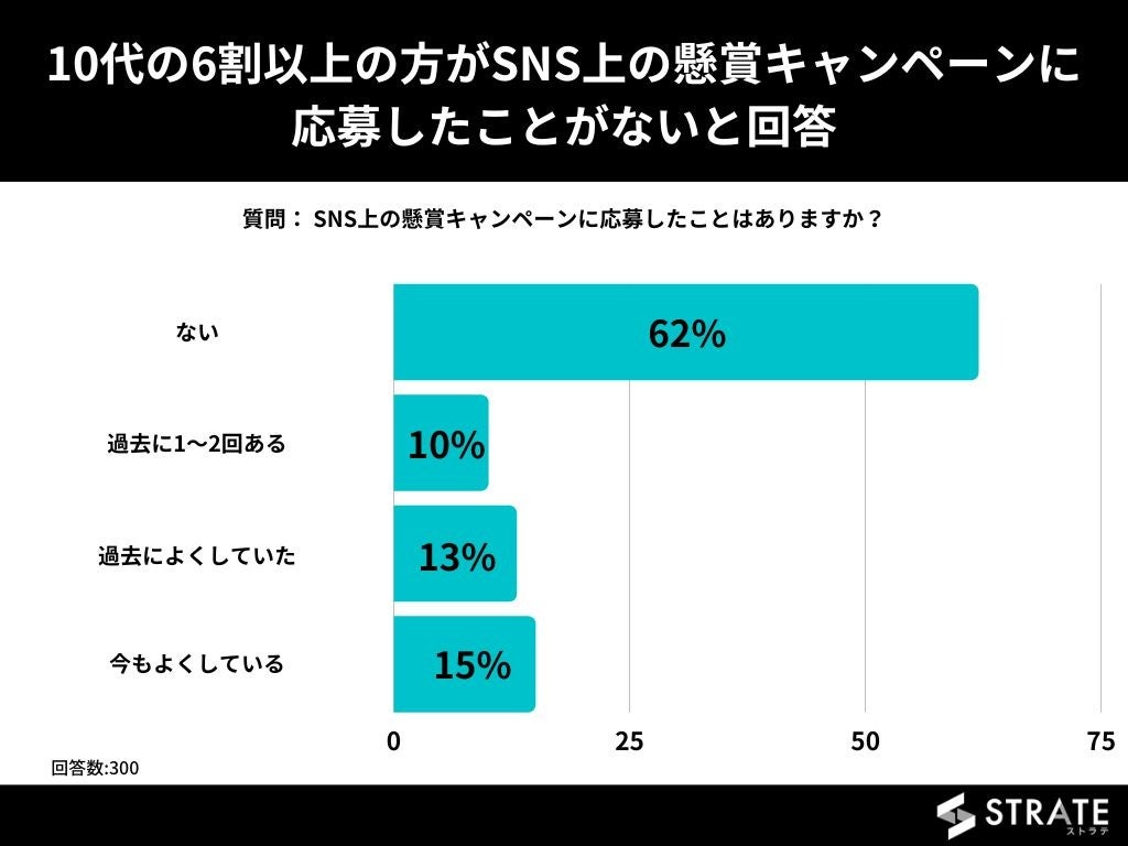 10代の男女を対象とした「SNS上の懸賞キャンペーンに応募したことはありますか?」というアンケートで最も多かった回答は「ない」で62%でした。