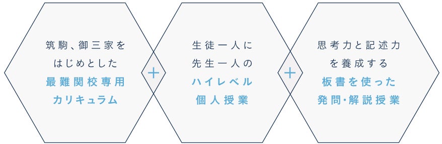 入試に精通した講師や専門部署が、過去の入試を分析して作成した個別指導専用オリジナル教材を使用。最難関校の受験に向けての土台作りから難問対策まで、合格に必要な力を効率的に伸ばせる独自の構成になっています。また、月例テスト、学校別そっくり模試などを定期的に開催。合格まであと何が足りないのかを浮き彫りにし、個別指導で課題を解決していきます。