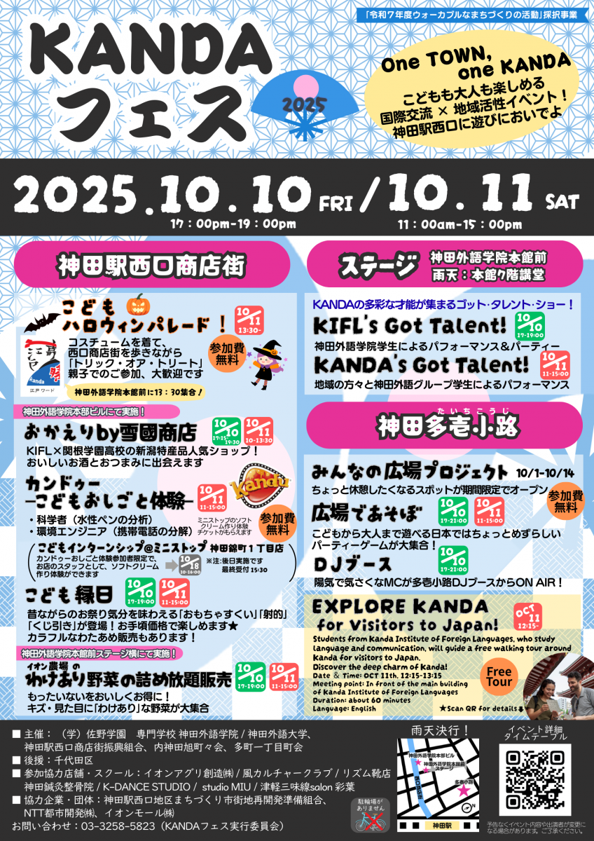 神田外語グループ(東京都千代田区/理事長:佐野元泰)は、千代田区後援の下、神田駅西口商店街振興組合、内神田旭町々会、多町一丁目町会等の地域、及びNTT都市開発株式会社、イオンモール株式会社等の企業と連携し、地域共創イベント「KANDAフェス2025」を2025年10月10日(金)・11日(土)の2日間、神田駅西口エリアにて開催いたします。本フェスは、千代田区推進する「ウォーカブルなまちづくり」の理念を背景に、公共空間を活用して人々が集い滞在したくなる場を創出するものです。地域住民・在勤者・在学者・来街者が交流できる機会を設けることで「顔の見える関係性」と「まちの一体感」を育み、神田の歴史・文化を再発見するともに、多文化共生や国際交流を発信し、地域ブランドの向上を目指します。