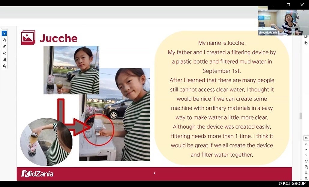 9月21日(土)のイベント当日は、オンライン会議ツール「Zoom」を活用し、キッザニア甲子園のこども議会議員10名とキッザニア釜山のこども議会議員8名が、それぞれ準備したワークシートを投影し、自身の行動内容を英語または自国語でプレゼンテーションをしました。いずれも双方のキッザニアスタッフが通訳を行いながら相互理解をサポートしました。