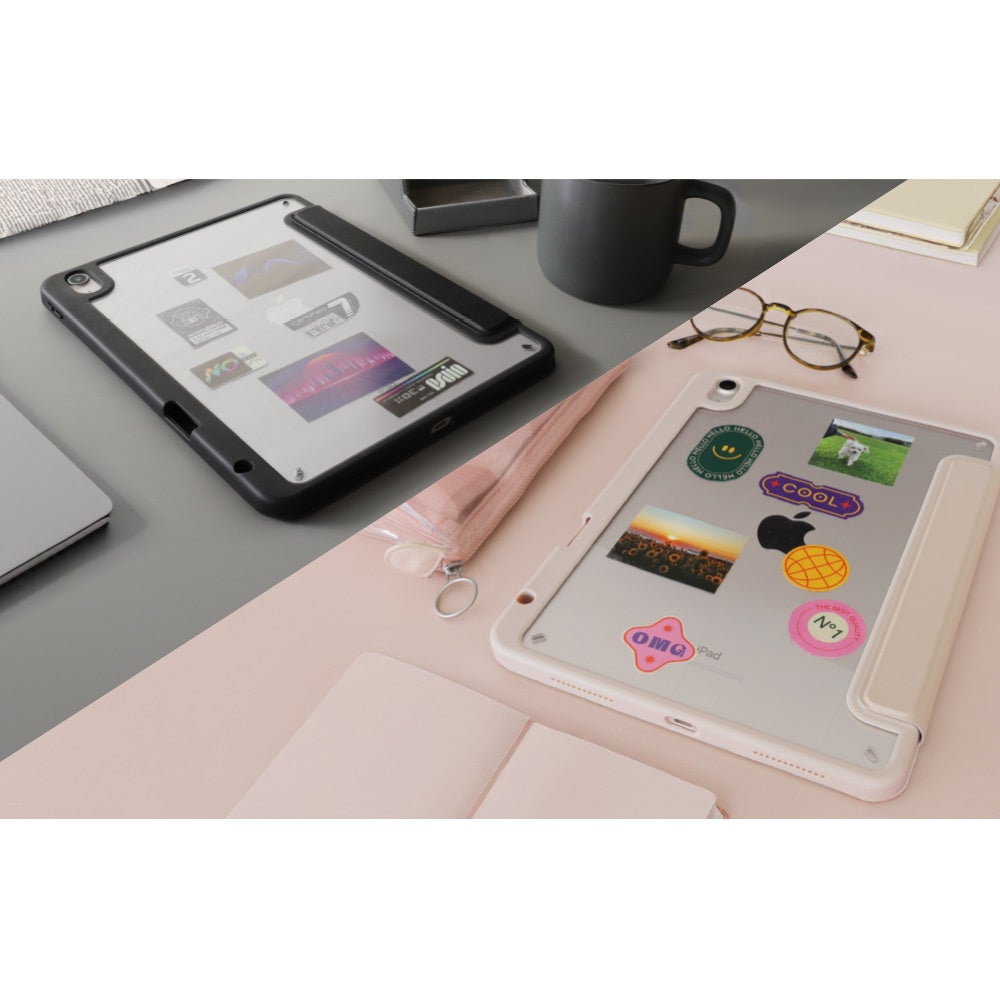 ケース背面にはiPadの本体カラーやロゴを隠さないクリア素材を使用。ステッカーや写真を挟み入れると自分だけのiPadケースをお楽しみいただけます。