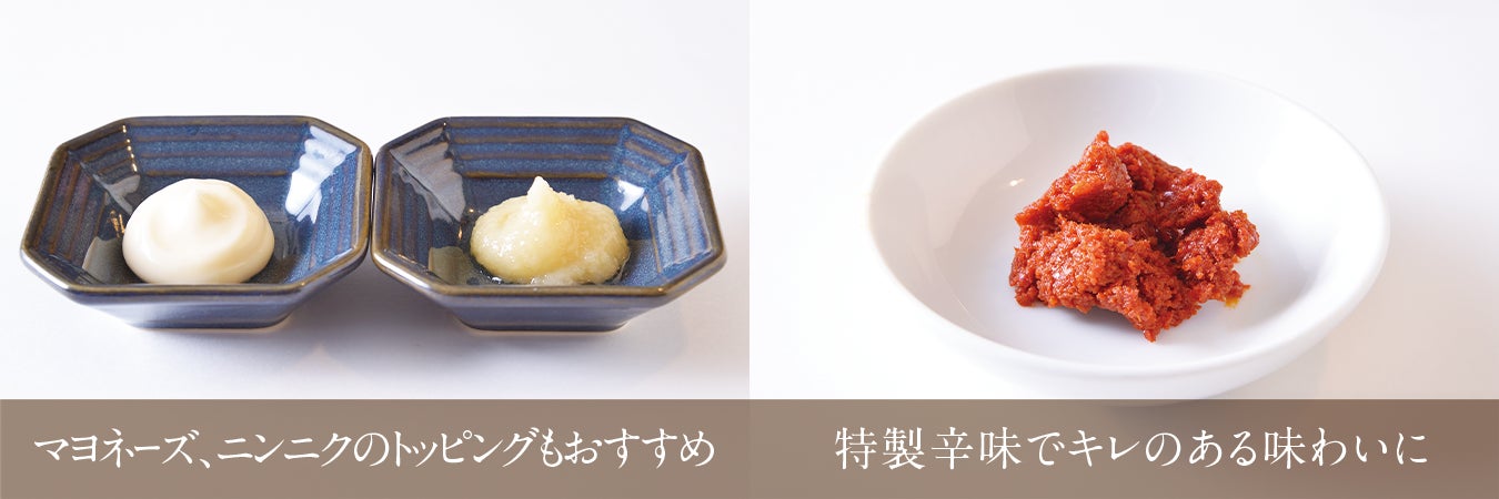 そのままでも十分おいしくいただけますが、マヨネーズ・にんにく・辛味ダレに加え、卓上のラー油・お酢など、お好みのトッピングをカスタマイズいただき味変できることも魅力です。ぜひお試しください。