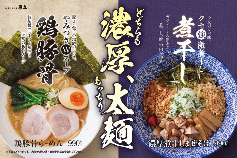 老舗らーめん店「銀座直久」より「鶏豚骨らーめん」と「濃厚煮干しまぜそば」の新登場2品を2024年11月1日(金)より期間限定販売