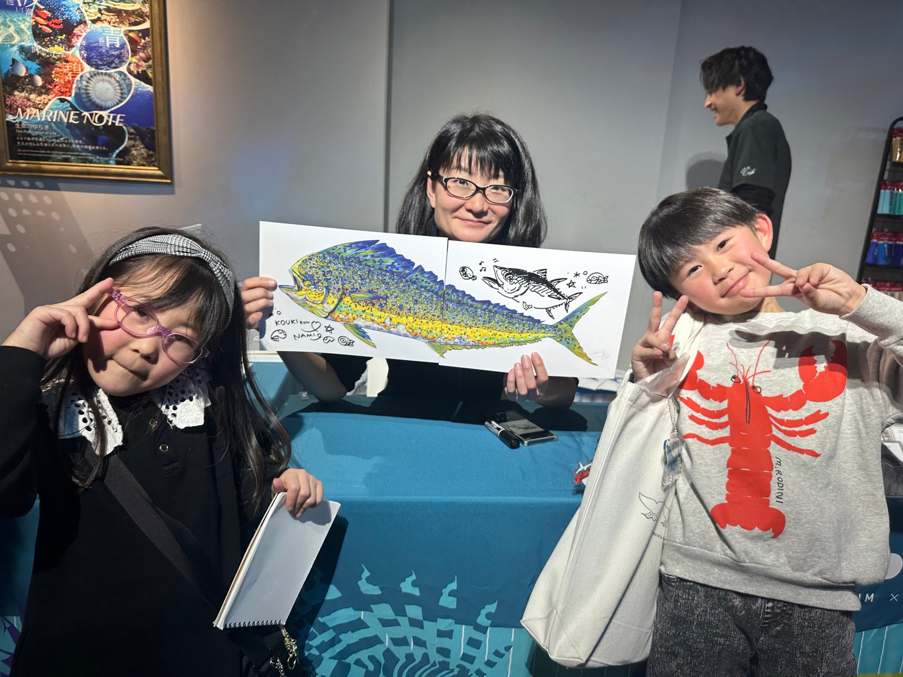 「きらきら=ぼし展」(1月12日~4月14日まで開催)のオープニングイベントとして、にぼしアーティストNAMIKO氏のサイン会を実施。好きな生きもののイラストを目の前で描いてくれる特別な時間に、お客様から「大好きなペンギンを描いてくれて嬉しい!大事にします」など、嬉しいお声をたくさんいただきました。