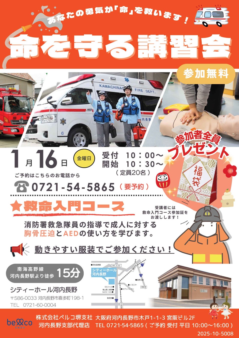 【参加無料】株式会社ベルコ堺支社・河内長野支部代理店『命を守る講習会(救命入門コース)』を1月16日に開催]