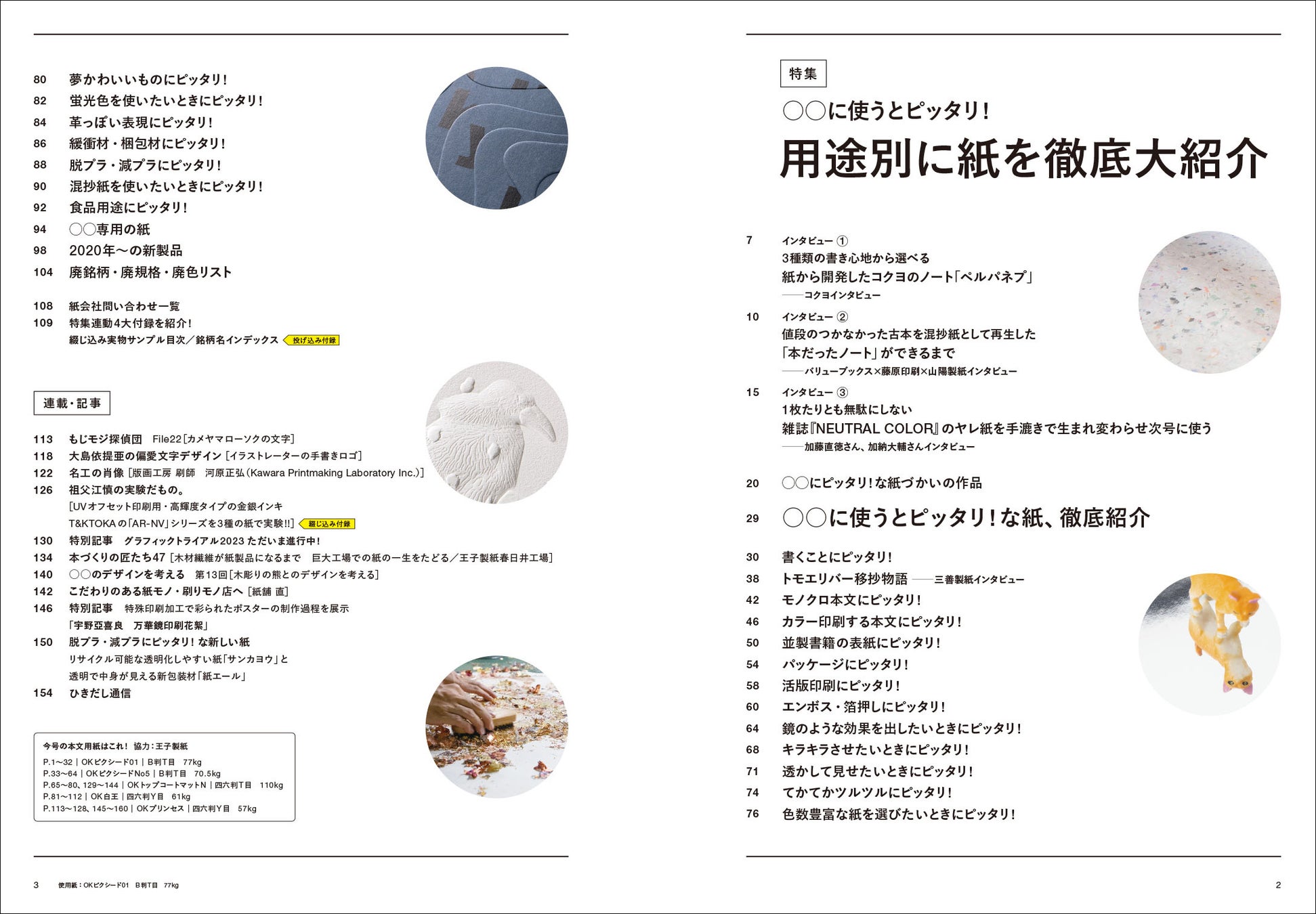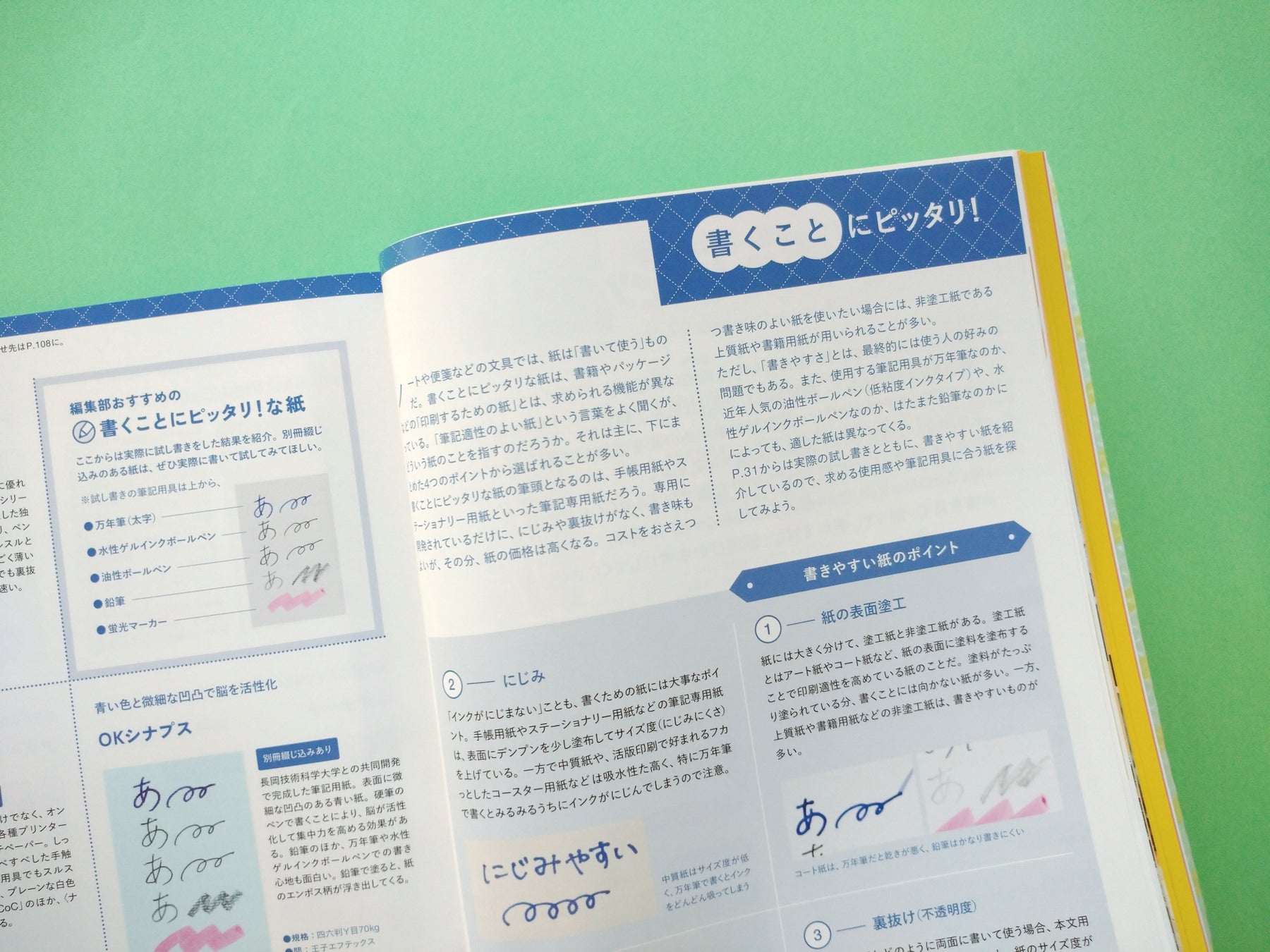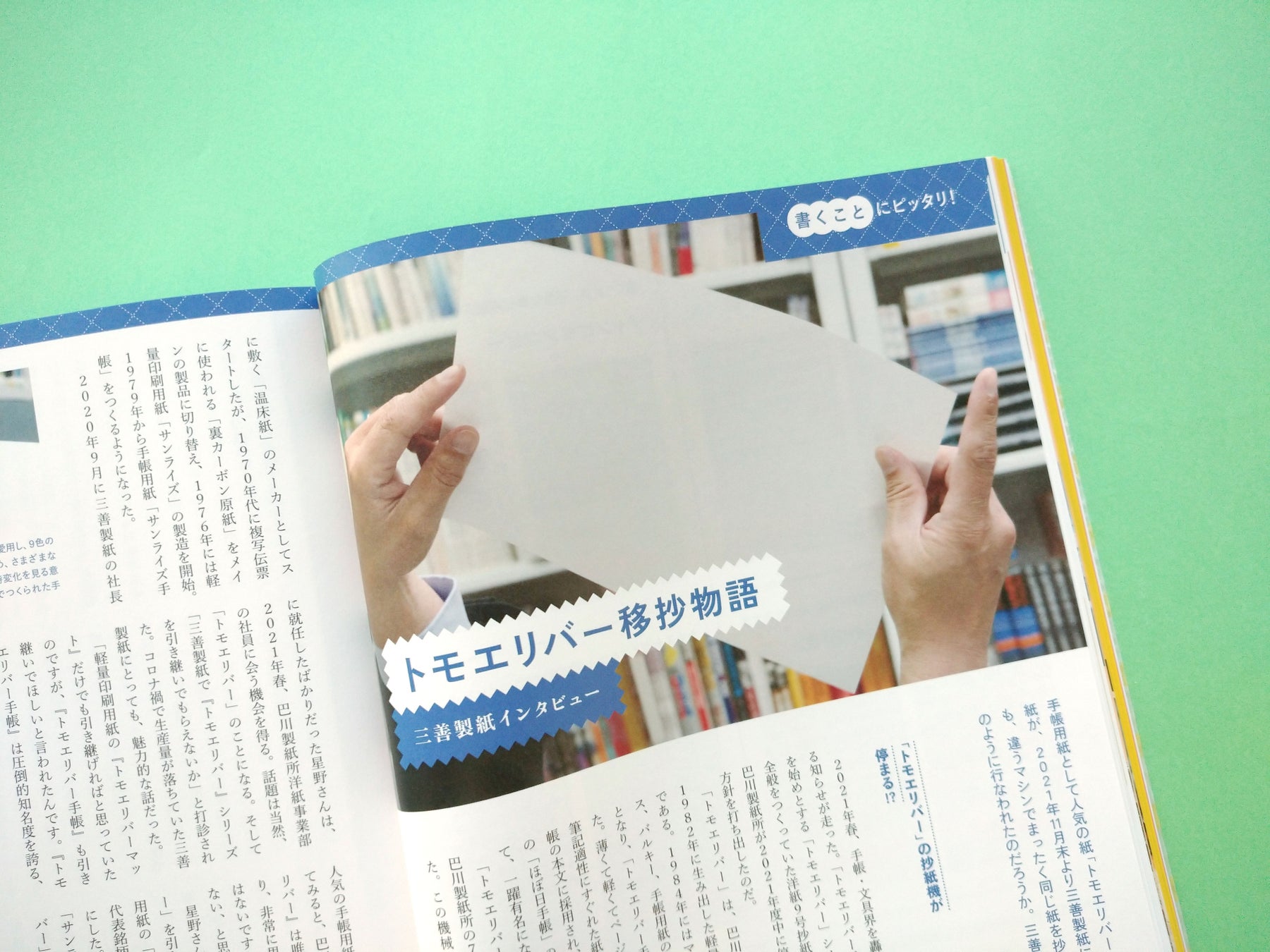 また、「ほぼ日手帳」の本文用紙に使用され、一躍有名になった手帳用紙「トモエリバー」の製造会社変更の舞台裏や、書き味が違う3タイプのノートを出したコクヨのインタビューなどの取材記事も掲載。