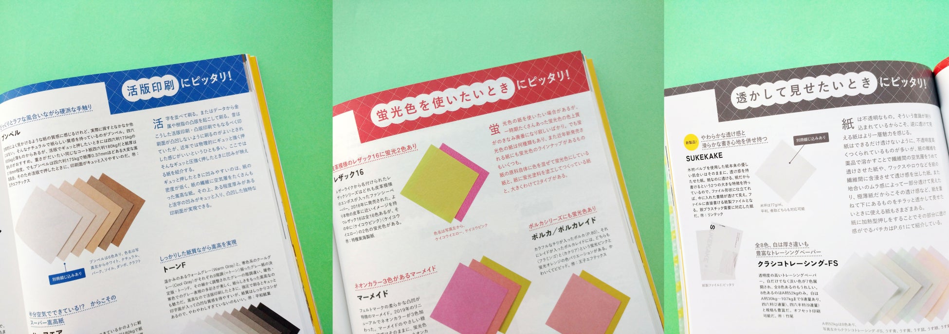 他にも「活版印刷にピッタリ!」「蛍光色を使いたいときにピッタリ!」「透かして見せたいときにピッタリ!」など、20カテゴリに分けて、紙をドドーンとご紹介。その中から150種類以上の実物サンプルを「○○に使うとピッタリ! な紙サンプルBOOK」に収録して添付しています。