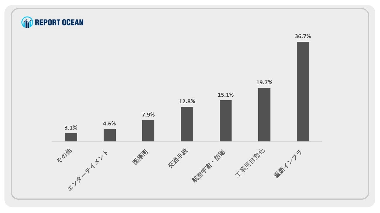 2023年のシェアは、重要インフラが36.7%と最も高いシェアを占めています。重要インフラは、データセンター、ユーティリティ/グリッド、テレコムインフラで構成さ れます。