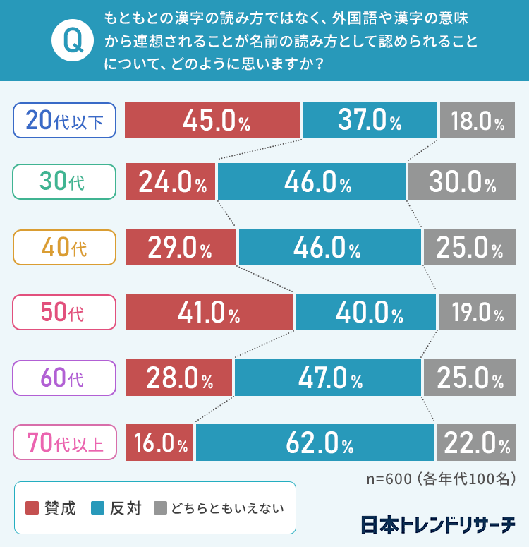 一方で、「一郎(たろう)」「高(ひくし)」など、明らかに漢字本来の読み方や 意味と異なる読み仮名が認められないことについては、全ての年代で認められないことに「賛成」という方が多数派となりました。