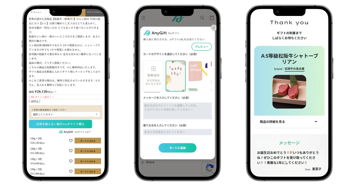 AnyReach株式会社(本社:東京都港区、代表取締役:中島 功之祐)は、株式会社長太屋(本社所在地:三重県志摩市、代表取締役社長:濱口 和人)が展開する「松阪牛の長太屋」にギフトサービス『AnyGift(エニーギフト)』の提供を開始しました。