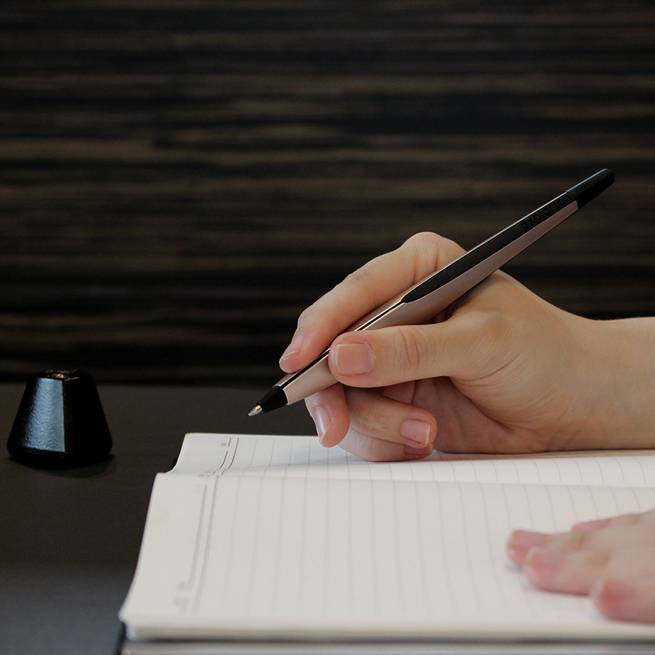 特徴的な三角形の断面形状により、親指・人差し指・中指が自然と正しい位置に収まり、書く時の指先が美しく見えるようにデザインされています。人間工学で検証したデータも取り入れ、手や腕への負担がかかりにくいカタチを実現。持った瞬間に“握りやすい”と感じる形状を実現しています。ペンの塗装には、高級車の内装で採用されている塗料を使用しました。芯は4C規格品またはD1規格品適合を使用可能なため、汎用性がある高級ペンになっています。