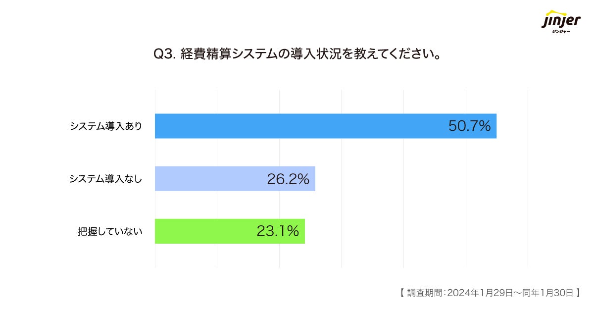 「経費精算システムの導入状況を教えてください」という質問に対し、「システム導入あり」が50.7%、「システム導入なし」が26.2%、「システムの導入状況を把握していない」という回答が23.1%となりました。