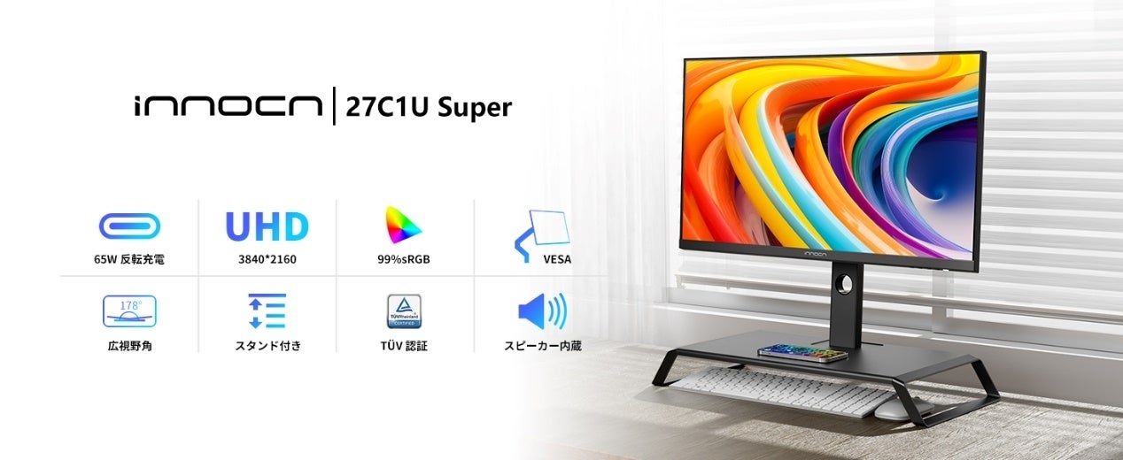 INNOCN 27C1U Superは27インチの4K UHD(3840 x 2160)IPS非光沢パネルを搭載し、台座付きモニターです。このモニターは99%のDCI-P3と99%のAdobe RGBカバー率を誇り、クリアな画質と完璧なカラーリーダリングを提供します。これにより、色の再現性が高く、映像がリアルかつ鮮やかに表現されます。高輝度パネルで最大320 nitsの明るさを提供し、DP1.4、HDMI2.0、Type-C(65W出力)、USB Hubs、3.5mmオーディオの豊富な接続性を備えています。さまざまなデバイスを接続して利用できます。