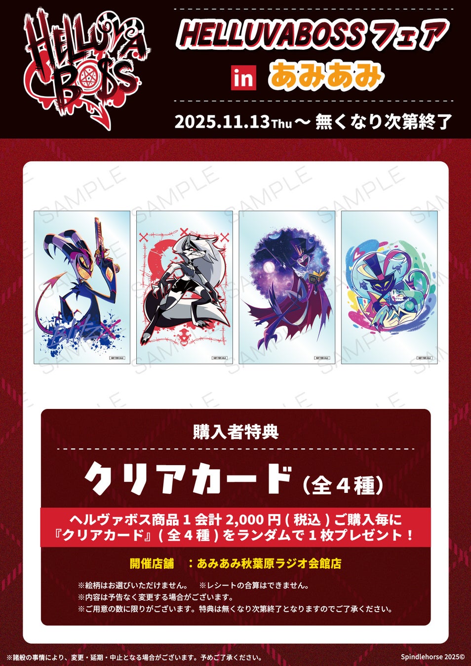 エンターテインメント関連商品を輸入・製造販売するインフォレンズ株式会社(本社:東京都中央区、代表取締役CEO:安川 洋)は、 世界的人気を誇る海外アニメ「HELLUVA BOSS(ヘルヴァ・ボス)」の関連商品をあみあみ秋葉原ラジオ会館店にて、1会計2,000円(税込)ご購入毎に、限定クリアカードを1枚(全4種)プレゼントする 、「HELLUVA BOSSフェア in あみあみ」を2025年11月13日(木)より開催することを発表いたします。