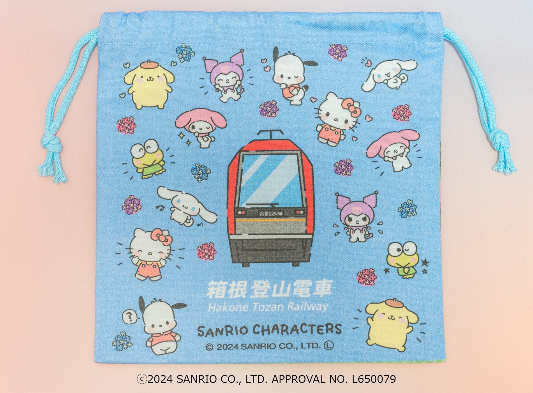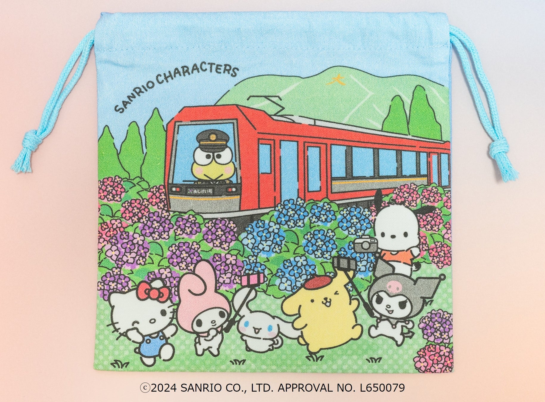 箱根旅行を楽しむサンリオのキャラクター達がデザインされた巾着袋です。裏面は10周年をお祝いするように、様々な表情のサンリオキャラクターズがアレグラ号を囲んでいます。