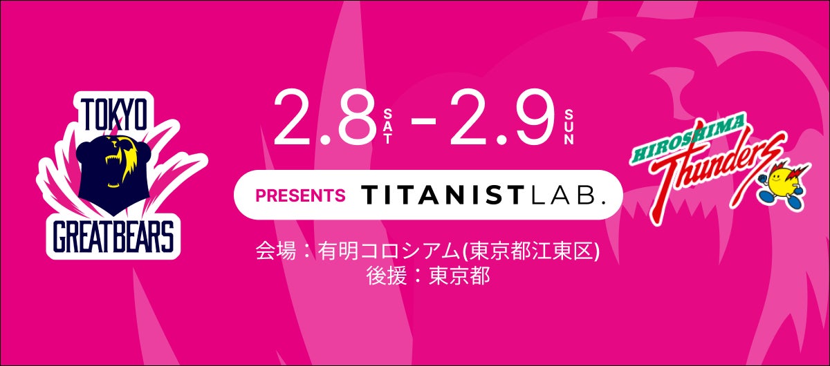 株式会社グレートベアーズ(本社:東京都渋谷区、代表取締役:久保田健司)は、2025年2月8日(土)、9日(日)に有明コロシアムにて開催される2024-25 大同生命 SV.LEAGUE MEN 東京グレートベアーズ ホームゲーム 広島サンダーズ戦において、東京グレートベアーズ オフィシャルパートナーである、チタニストラボラトリーズ株式会社をマッチデースポンサーとして、ホームゲームを開催することとなりましたのでお知らせいたします。
