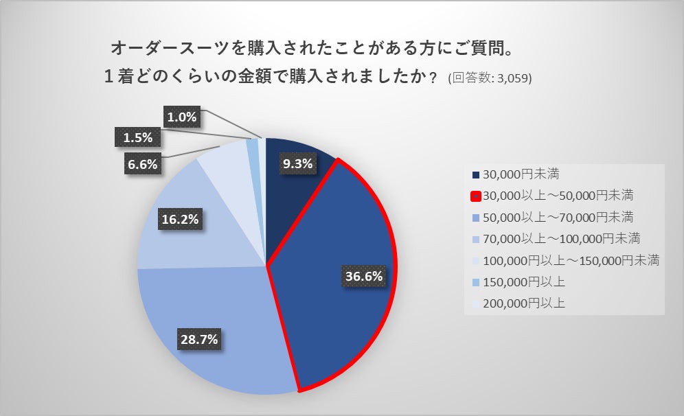 ■オーダースーツの一番多い印象として値段が高く、「5万円~7万円未満の価格帯」とイメージする方が多いが、実際に購入された方の価格帯は「3万円~5万円未満」