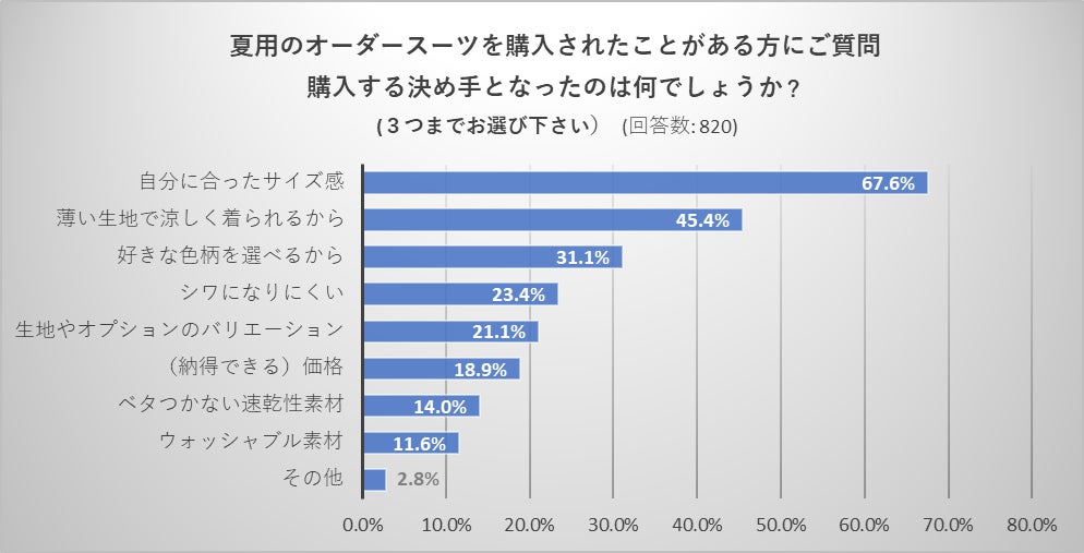 ・夏用オーダースーツの所持率は26.8%と低いものの、実際に購入された方は「清涼感」や「着心地の良さ」を高く評価しています。購入の決め手としては、「自分に合ったサイズ感=67.6%」や、「薄い生地で涼しく着られる=45.4%」が挙げられています。