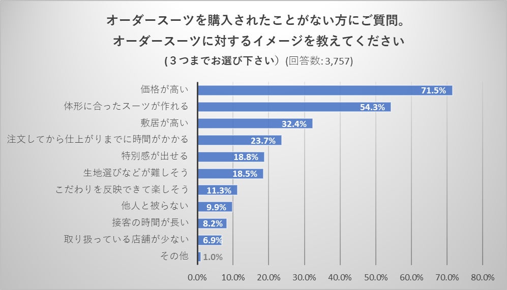 ・「オーダースーツに対するイメージを教えてください」という質問に対し、「価格が高い」というイメージが71.5%、次に「体型に合ったスーツが作れる=54.3%」、「敷居が高い=32.4%」と続きます。