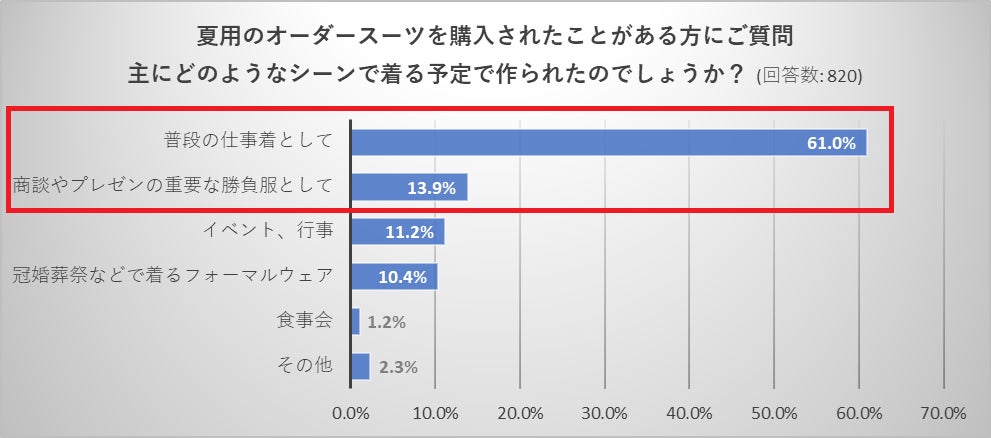 ・夏用オーダースーツを購入された方の着用シーンとして、「普段の仕事着」と「商談やプレゼンの重要な勝負服」の回答を併せると74.9%の方が仕事用として購入