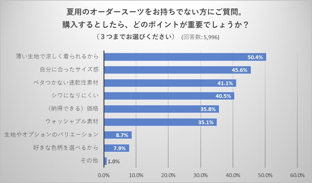 ・夏用のオーダースーツをお持ちでない方へ夏用オーダースーツを購入するとしたらどのポイントが重要か、という質問に対し「薄い生地で涼しく着られる=50.4%」「ベタつかない速乾性素材=41.1%」「ウォッシャブル素材=35.1%」などが上位となっています。