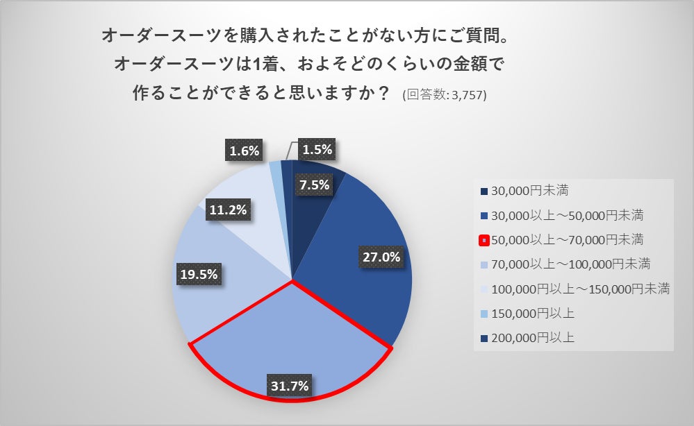 ・オーダースーツを購入されたことがない方に「オーダースーツは1着、およそどのくらいの金額で作ることができると思いますか?」という質問に対し「5万円~7万円未満」が31.7%と最多。