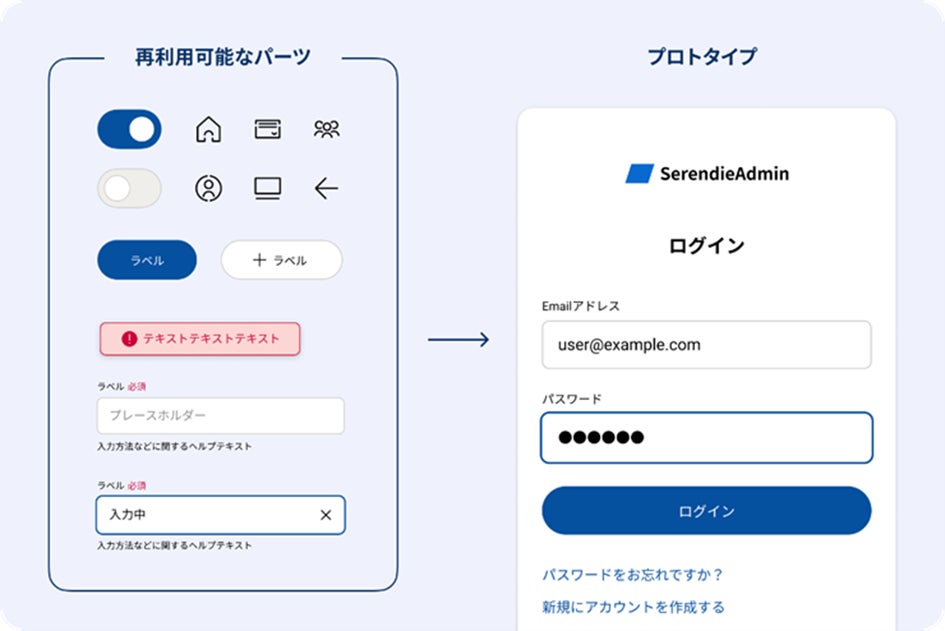 「Serendie Design System」は、当社の多様な事業領域で培われた知見を集約し、再利用可能で豊富な数のデザインパーツを有する、当社初の事業領域を横断したデザインシステムです。本システムは、「Figma」を活用し、利便性や操作性を考慮して設計されたデザインパーツを組み合わせるだけで、簡単にUIデザインの作成が可能で、高品質で統一感のあるUIを簡単に構築できます。また、「Figma」とWebアプリケーション開発で広く利用されているJavaScriptのライブラリーである「React」の連携により、デザインから実装への移行を大幅に効率化できるため、開発期間の短縮に貢献します。さらに、動くプロトタイプを短時間で作成して、ユーザーからのフィードバックを得ながら迅速にUIデザインを改善できるため、PoC(※6)開発にも最適なツールです。