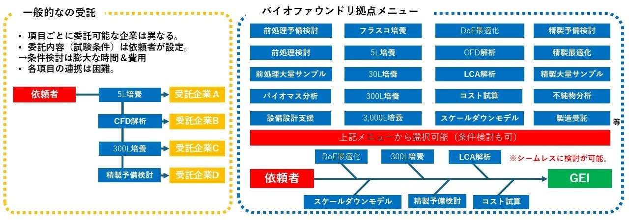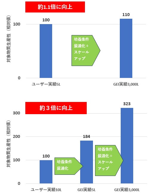 例として案件1では、GEIは培養条件の最適化検討を行った上で3000Lスケールアップ実証を行い、ユーザーの5L発酵槽での実績と比較して約1.1倍生産性が向上しました。案件2では、5L培養槽で最適化検討を行った上で3000Lまでスケールアップ実証を行い、ユーザーのデータと比較して、最終的に約3倍まで生産性を向上させました。
