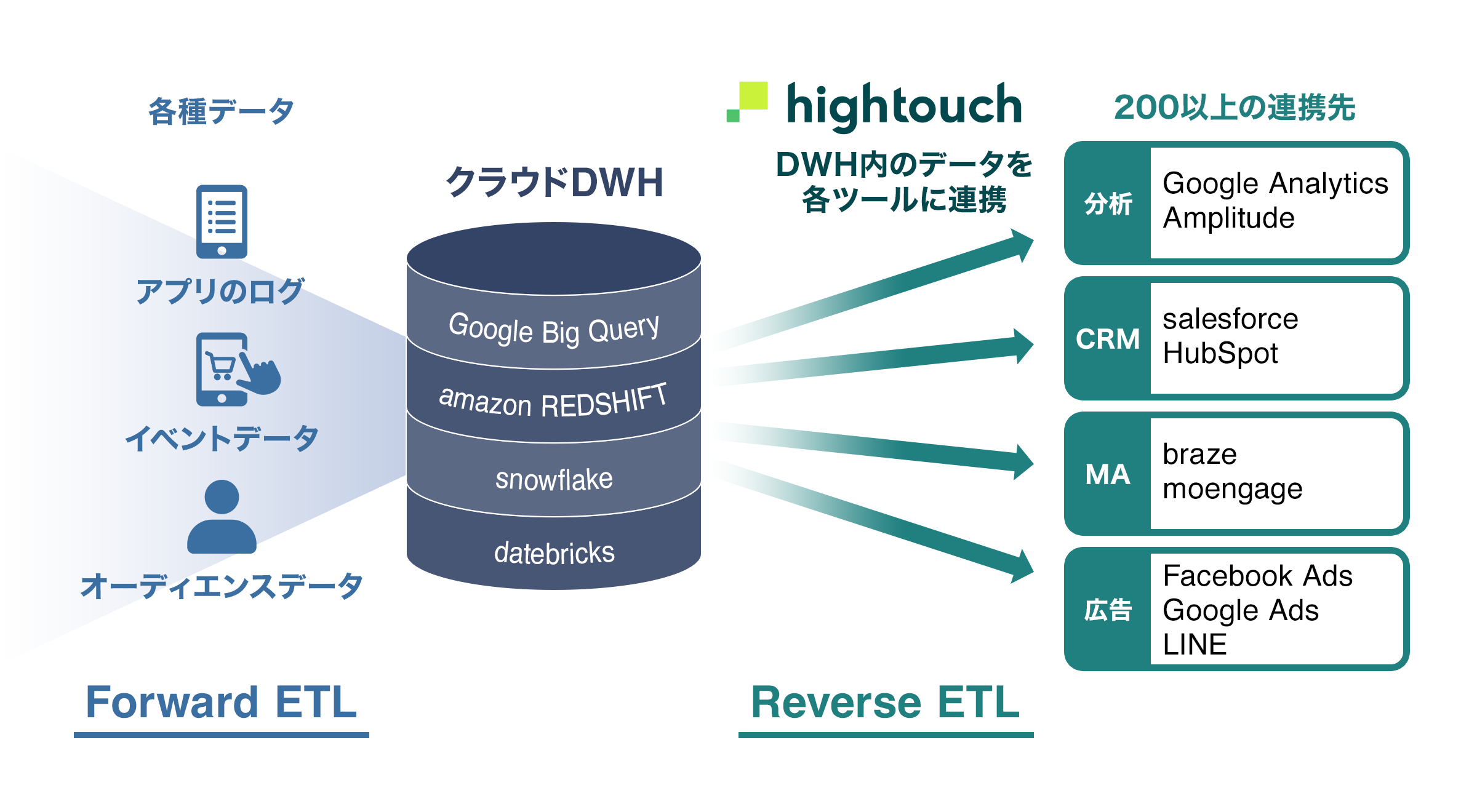 Hightouchは「リバースETL」と呼ばれる技術のパイオニアであるデータ連携プラットフォームで、企業がクラウドDWH(データウェアハウス)内の顧客データを整え、200以上のマーケティングツールや広告プラットフォームに直接連携することを可能にします。