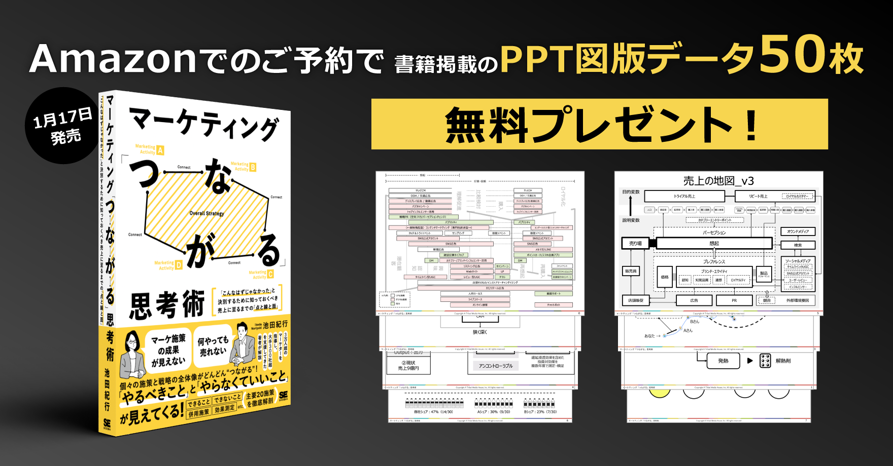 本書籍の発売を記念して、対象期間中にAmazonで予約購入・ご応募をいただいた方全員に、書籍掲載PPT図版データ50枚をプレゼントいたします。マーケティング戦略・施策を思考するときに活用できる、代表 池田考案のオリジナル図版です。みなさまのビジネスシーンでぜひご利用ください。