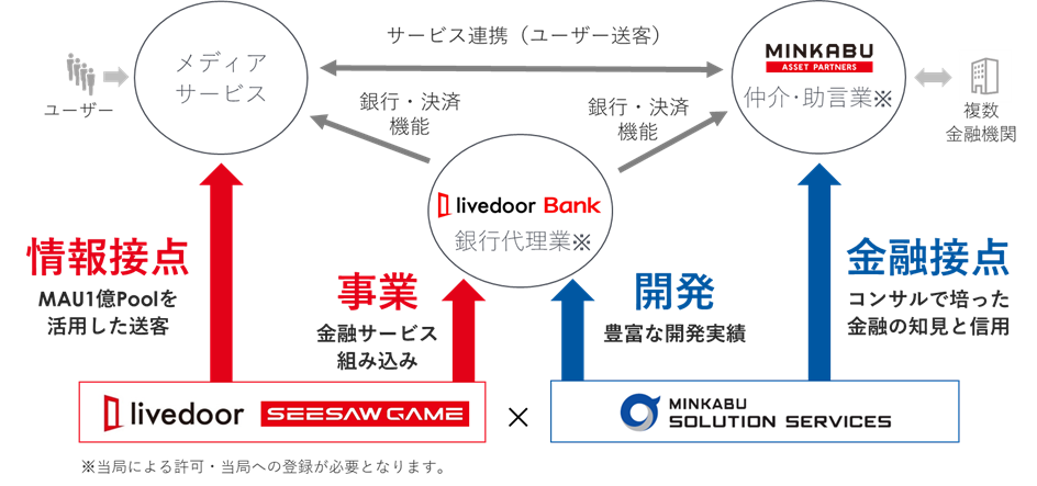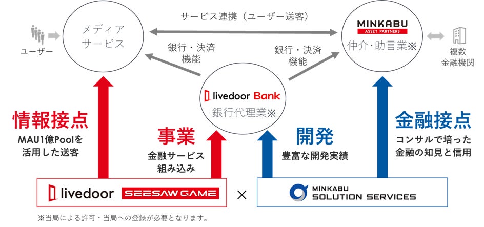 「ライブドアバンク」の開始にあたりましては、住信SBIネット銀行株式会社と協業し、同社が提供する「NEOBANK®」(注3)を活用いたします。これにより極めて少額な初期投資と運営費で銀行代理業への参入が可能となります。また、当社金融ソリューション子会社で、住信SBIネット銀行株式会社とも豊富な開発実績のある株式会社ミンカブソリューションサービシーズ(以下「MSS」)が金融サービスの構築で培った技術力とノウハウで内部開発並びに運用を支援します。さらにマス層に対する情報拡散力を有する「ライブドアニュース」に加えて、ユーザースティッキネスの高い自社バーティカルメディアにおける各ユーザー属性と利用シーンに合った効率的な販売促進展開により、多額のマーケティングコストをかけずにユーザー訴求が可能となります。さらに、MSSの子会社である株式会社ミンカブアセットパートナーズが提供予定の資産形成層向けサービスとの連携を図る等、当社グループのリソースをフル活用した事業展開を図ってまいります。